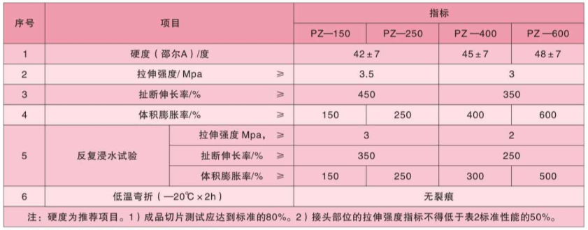 制品型遇水膨脹止水條又稱PZ制品型遇水膨脹止水條。它是一種既有一般橡膠制品的性能,又有遇水自行膨脹性能的新型防水材料。止水、防水效果比一般橡膠止水條更為可靠。使用壽命為50年。